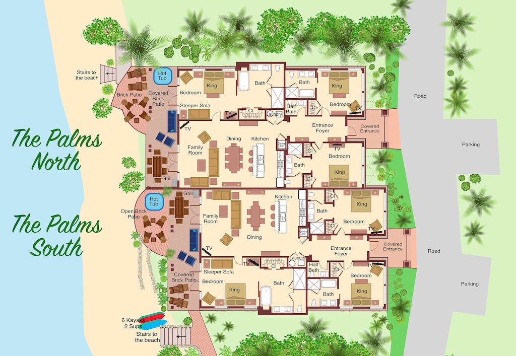 Luxury at it's finest!! Breathtaking views abound in this beachfront paradise that is only steps to the crystal- clear turquoise ocean. There are never any crowds on this beach!! The villa is all on one level, easy access with *No Stairs* all the rooms are on one floor, open concept living/dining/kitchen area. All bedrooms have en-suite bathrooms with double sinks. A separate powder room in the grand entry hall. Corn hole toss for the beach and lots of games for indoor fun! Huge patio with comfortable lounge chairs and outdoor dining area and a grill for outdoor cooking. Enjoy lounging on the beach just outside your villa with a cold drink in hand while gazing out at the turquoise Caribbean Water and listening to the gently crashing waves. Enjoy kayaking, snorkeling, stand-up paddleboarding...it's all right here! This is what you came for!! We offer beach massages, yoga on the beach, live music to serenade you while dining al fresco on our brick patio watching the boats go by. Take a refreshing swim in the ocean and enjoy the jetted hot tub to relax in after. The evening sunsets paint the sky in vibrant colors of red, orange & yellow hues. The Palms Villa is the ultimate vacation for relaxation and fun. We look forward to assisting you in planning a spectacular vacation at The Palms. Call Today, we're always happy to assist you.